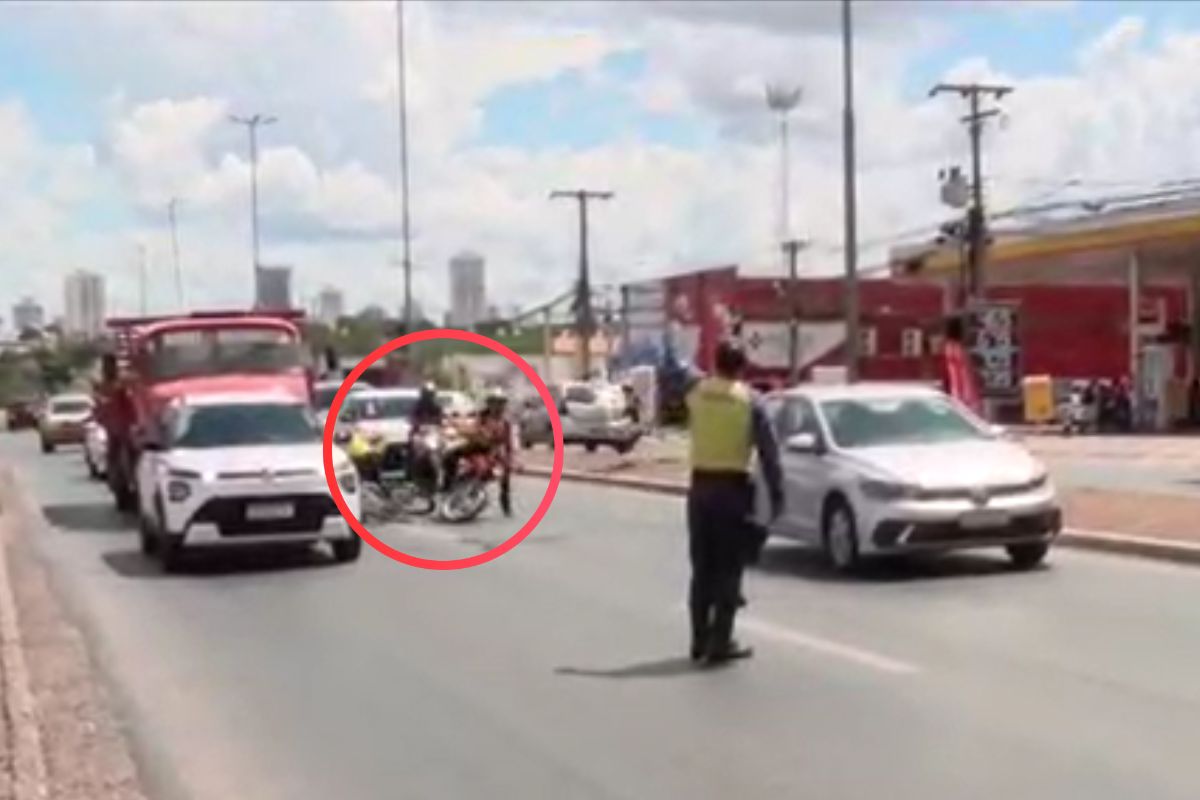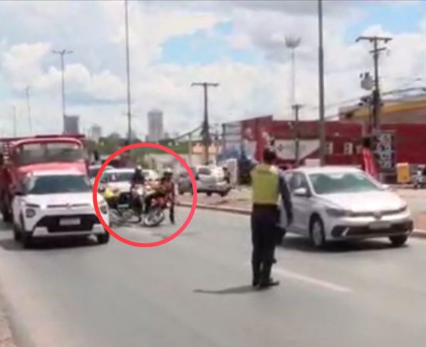 Em uma dessas paralisações, o ciclista que seguia pelo canteiro central aproveitou a parada dos veículos e decidiu atravessar a via. Nesse momento, ele foi atingido por uma moto que passava pelo corredor, entre os carros parados; veja abaixo: