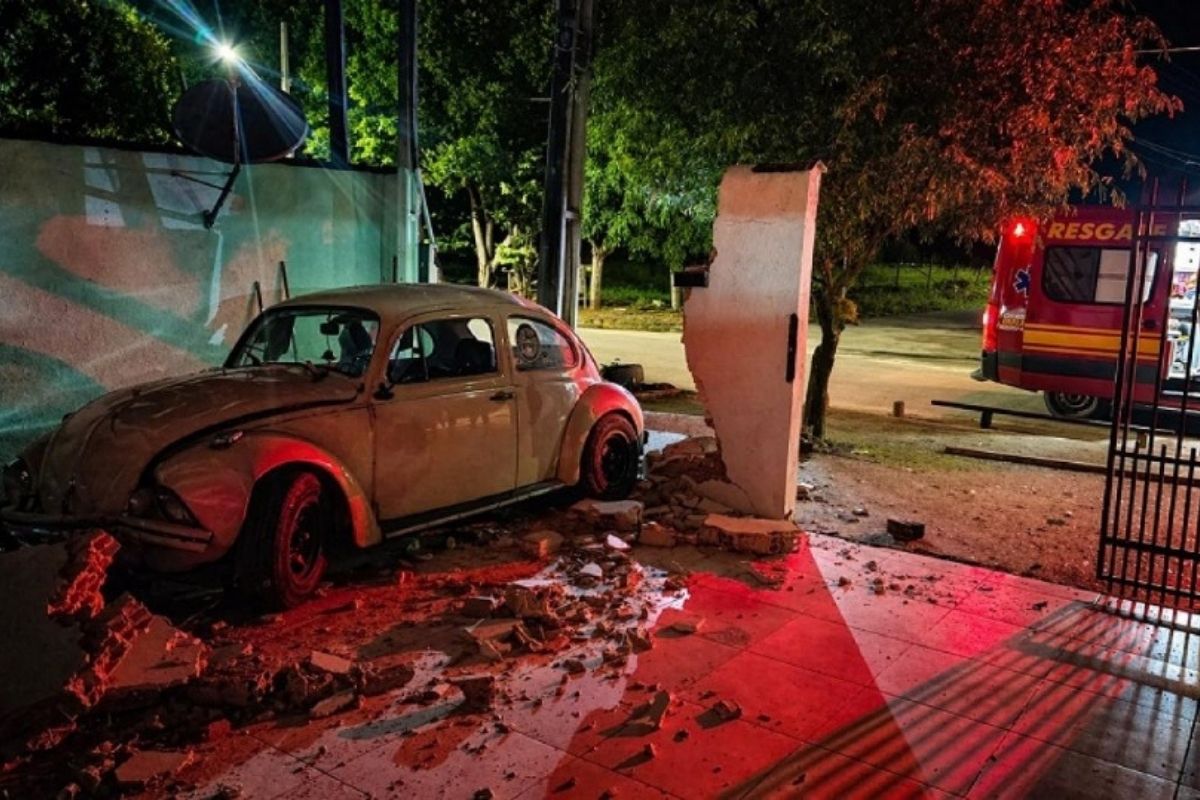 Um Fusca perdeu o freio, avançou um cruzamento e invadiu uma residência na madrugada desta segunda-feira (20), em Alta Floresta (MT). Com o impacto, o muro do imóvel foi completamente destruído e três pessoas que estavam no veículo foram encaminhadas ao hospital.